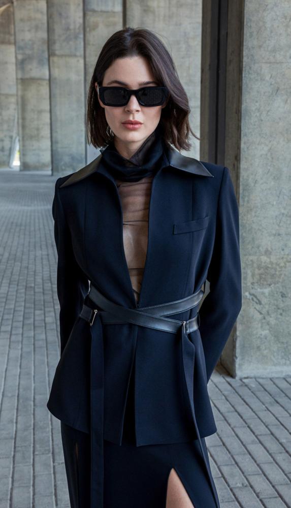 تيور بلايزر مطعم بالجلد وحزام متعاكس وتنورة ميدي
