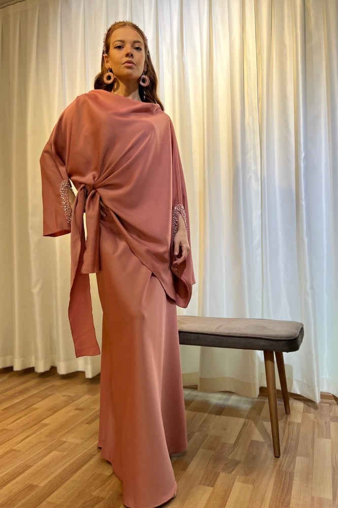 CYDA طقم حرير كريب بشك على الأكمام “وردي"
