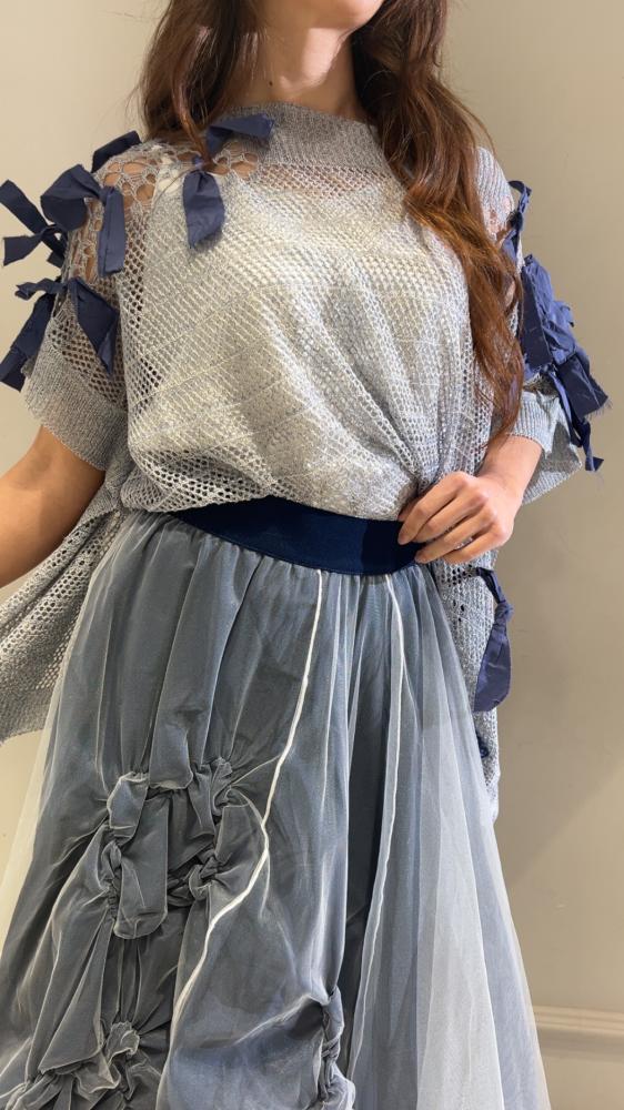 - بلوزة شبك كحلي بتفاصيل شريطية على الأكتاف تضيف لمسة عصرية