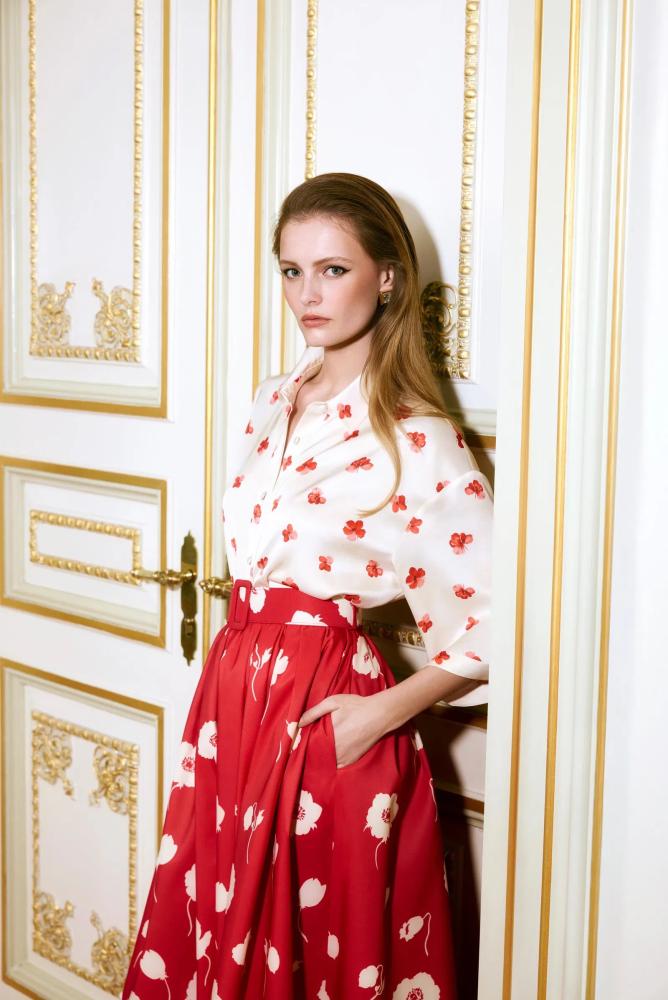 - التصميم: طقم مكون من قميص بأكمام طويلة وتنورة بتفاصيل لونية متعاكسة