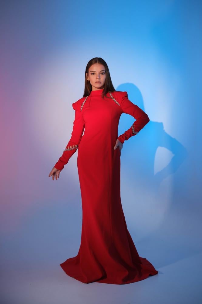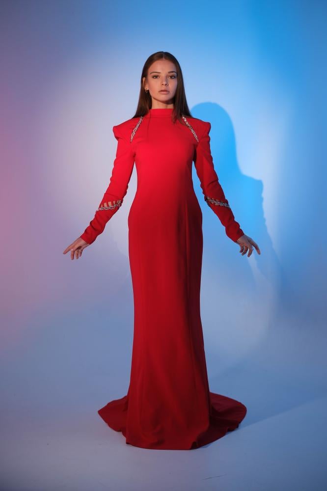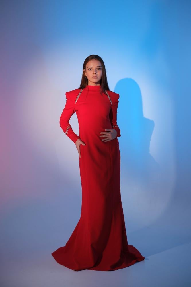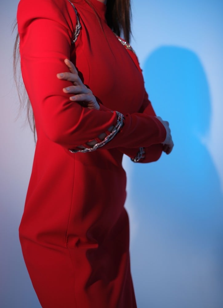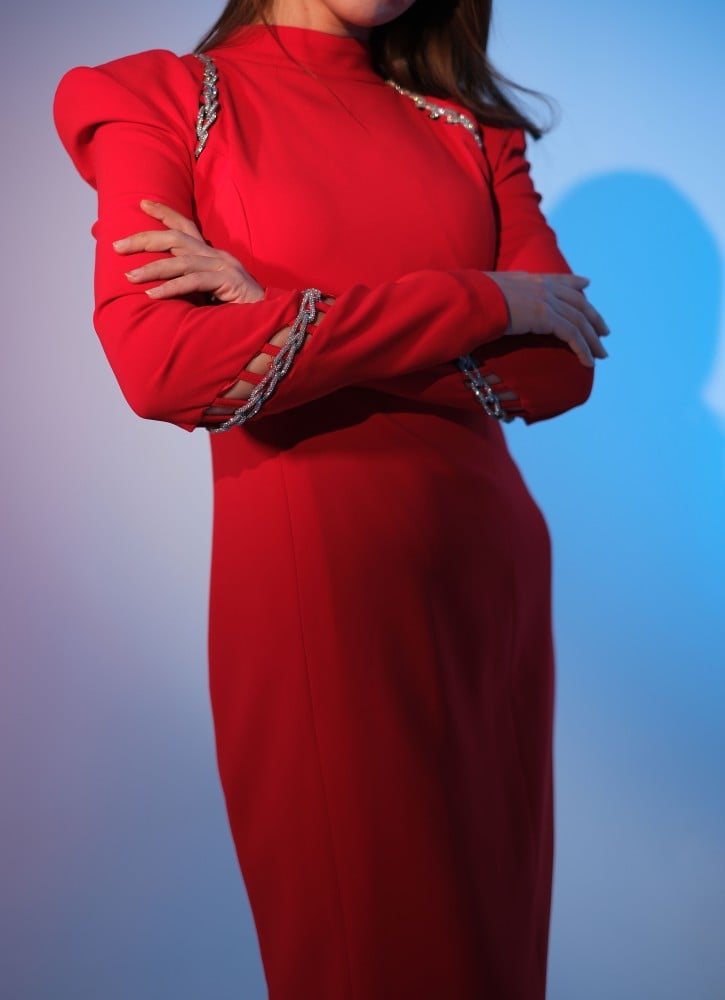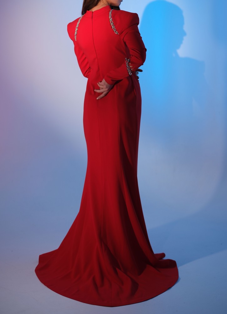 فستان كريب مكسي بكرستالات مجدولة "أحمر ناري"