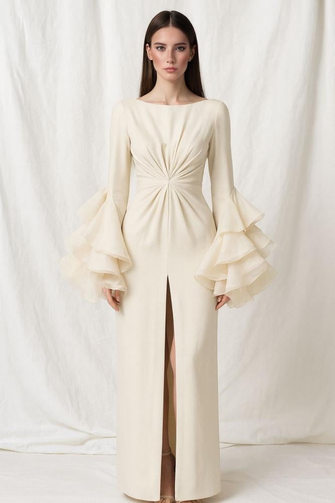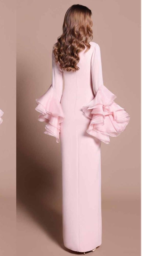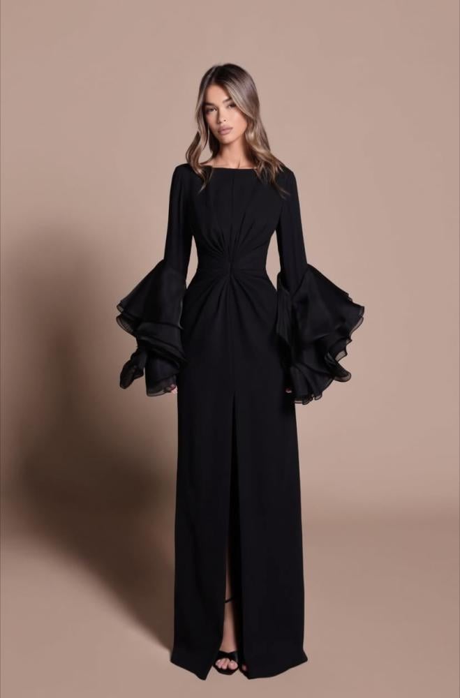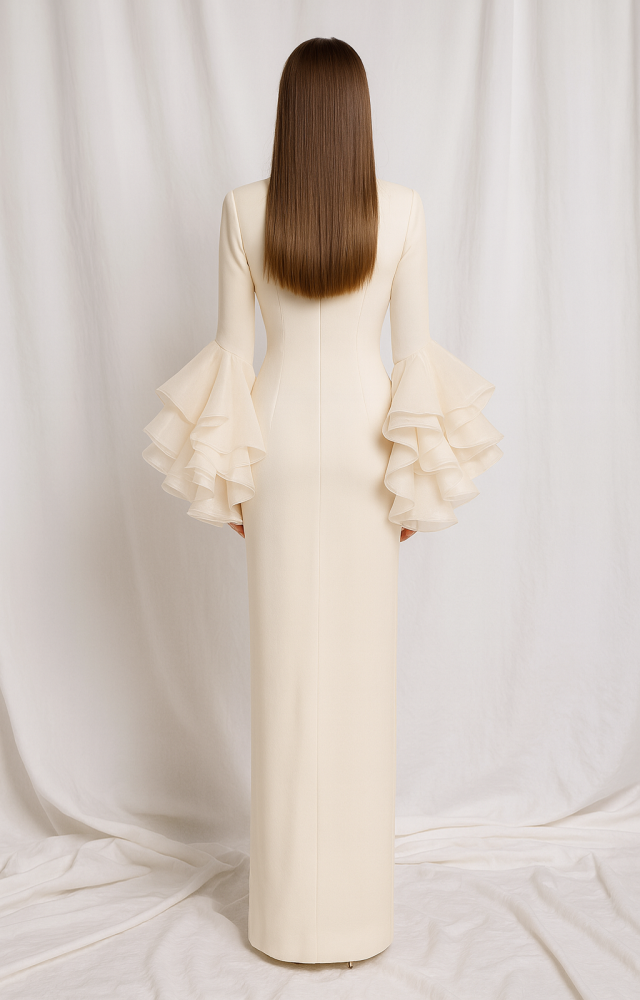 - أكمام رافلز بطبقات واسعة تعطيك إحساس بالفخامة والحضور الملكي