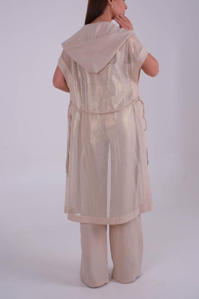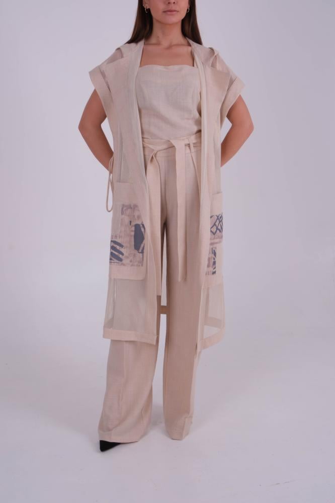 - الطقم مصنوع من كتان خفيف بس غير شفاف ومع ذلك يُفضل ارتداء بطانة بلون محايد لو كنتِ تفضلين تغطية أكثر خصوصًا تحت الإضاءة القوية