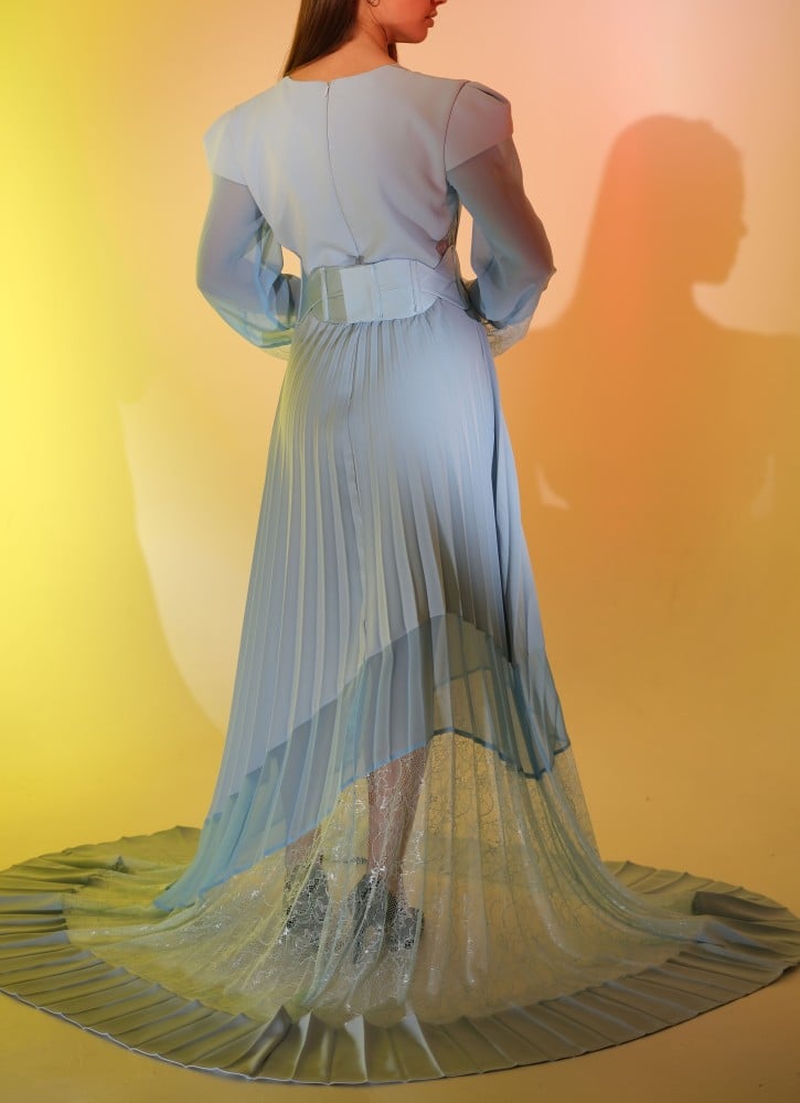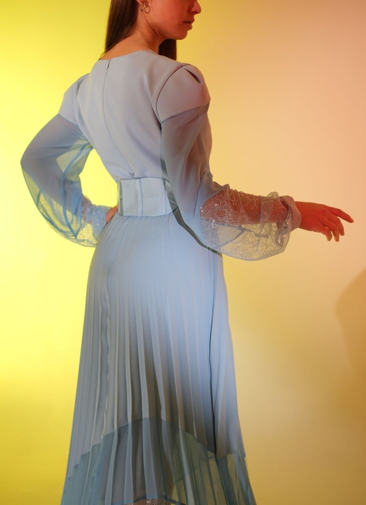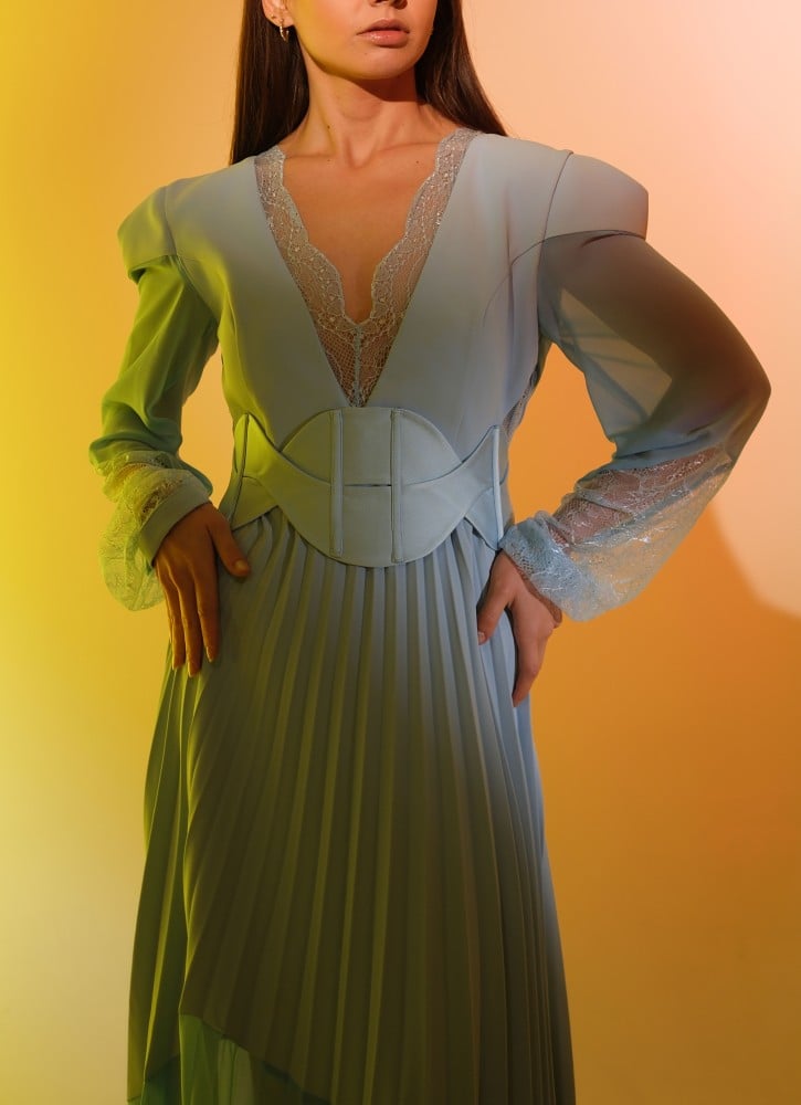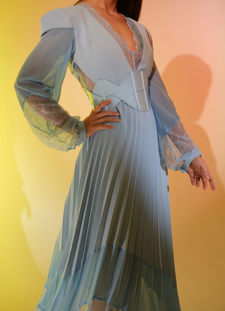فستان مزيج شيفون وكريب ولمسات دانتيل بحزام "لونين"