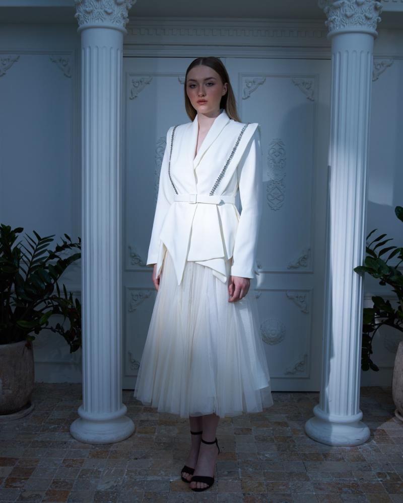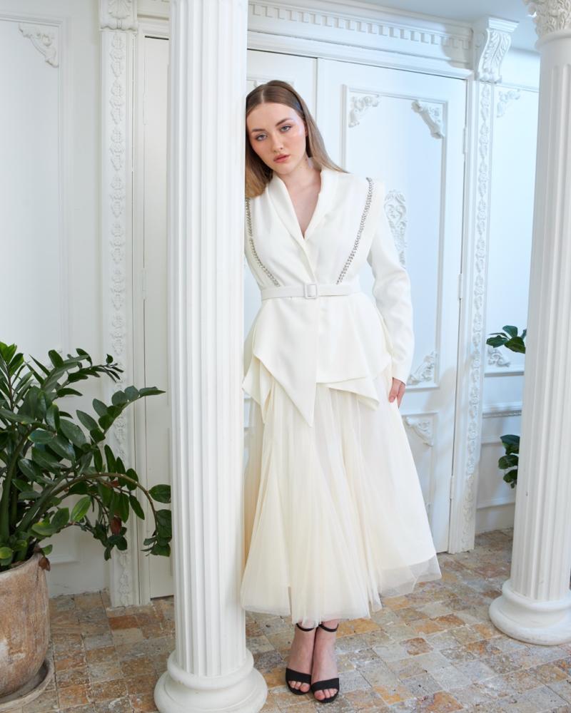 MELTEM فستان جاكيت مكسي بدرابيه على الصدر لونين