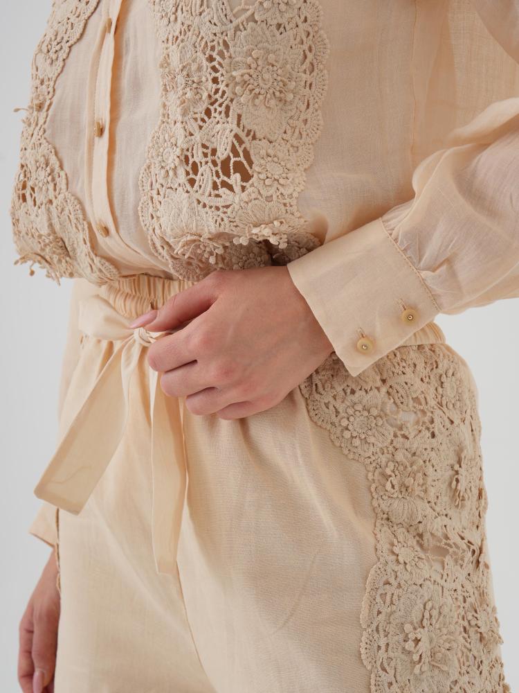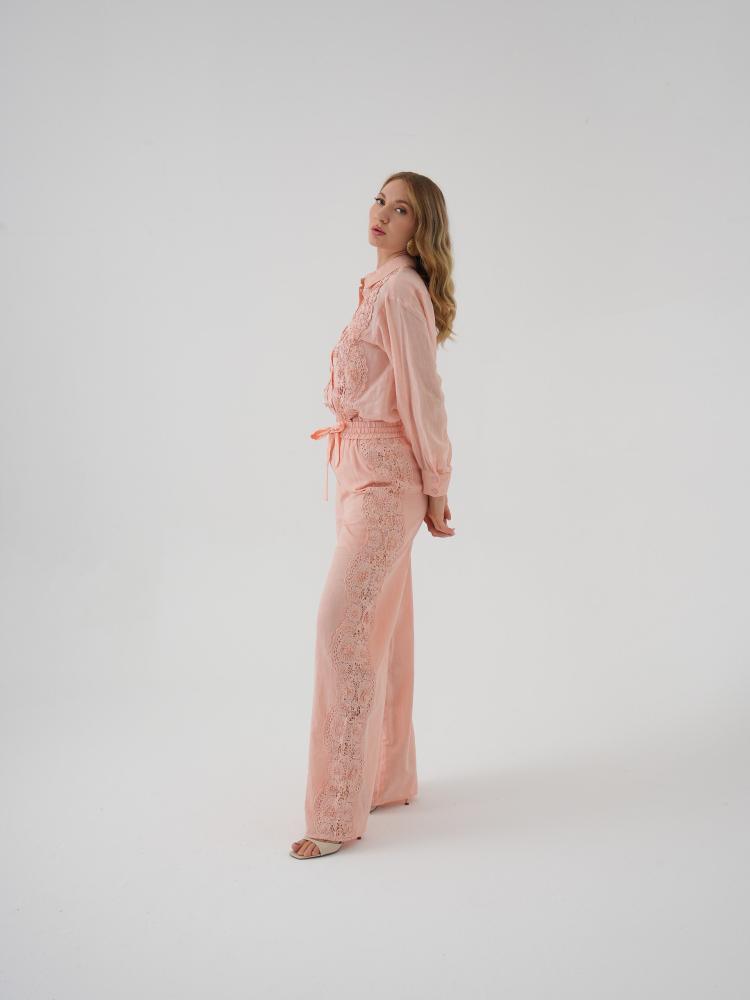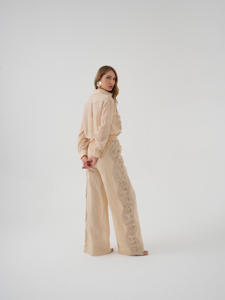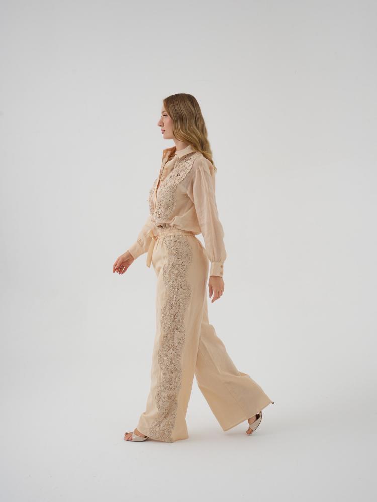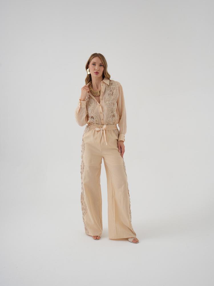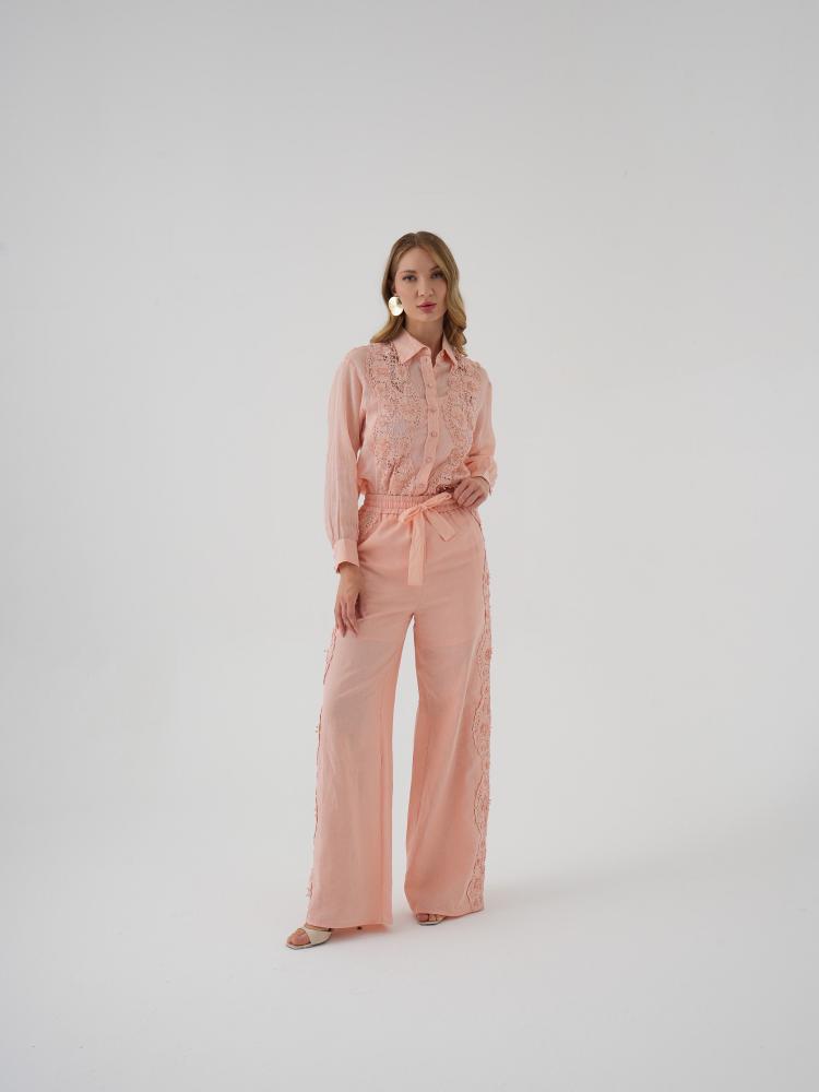 - التصميم: بلوزة مزخرفة بتطريز دقيق وأنيق بنطلون واسع يضيف
