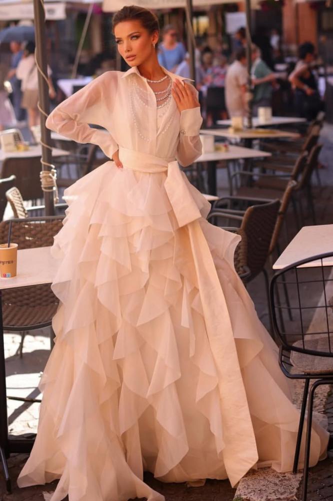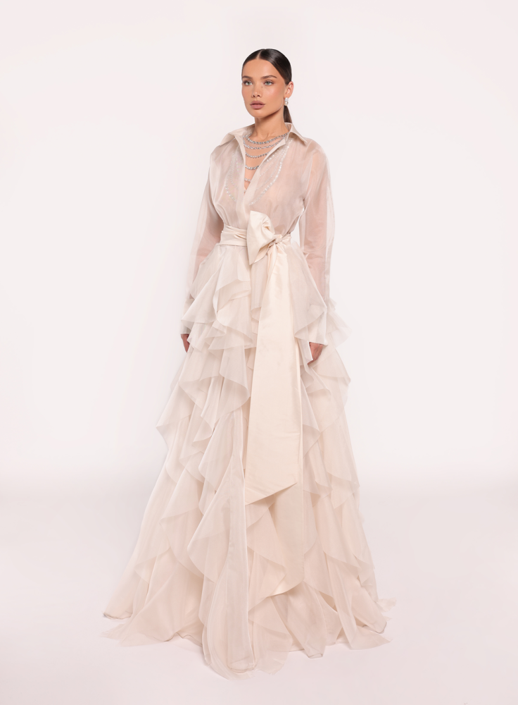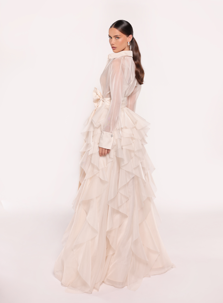 - القصة: قميص حريري شفاف بأكمام طويلة وياقة كلاسيكية، يتصل بتنورة منفوشة من طبقات متعددة.