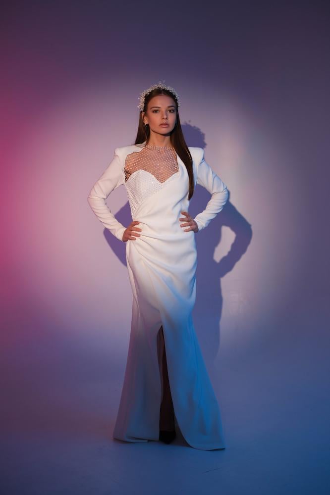 طارق ايديز طقم كريب ايطالي مطرز بوردة سوارفسكي وردي