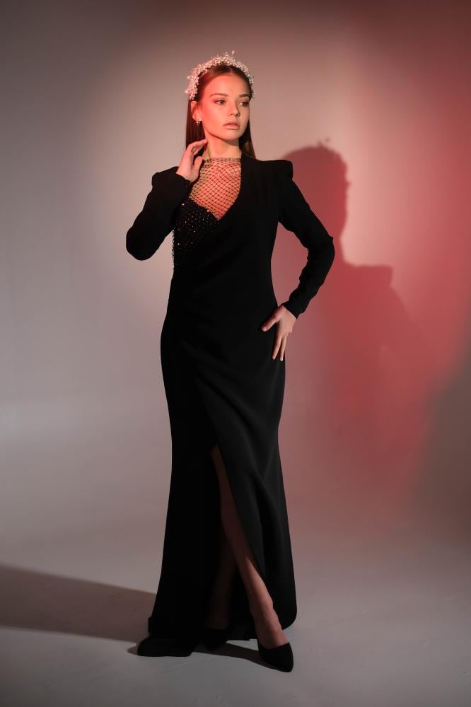فستان كريب بشبكة لامعة على الصدر "لونين"