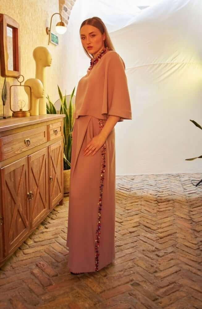 تبغين تخطفي كل الأنظار بس بدون ما تبذلين مجهود؟ طقم كريب وردي Bella ينسدل عليك بنعومة كأنه مفصّل على هدوءك وثقتك.. شغل يدوي فخم يوازن بين الرقي والبساطة ويخلي حضورك يتكلم عنك.