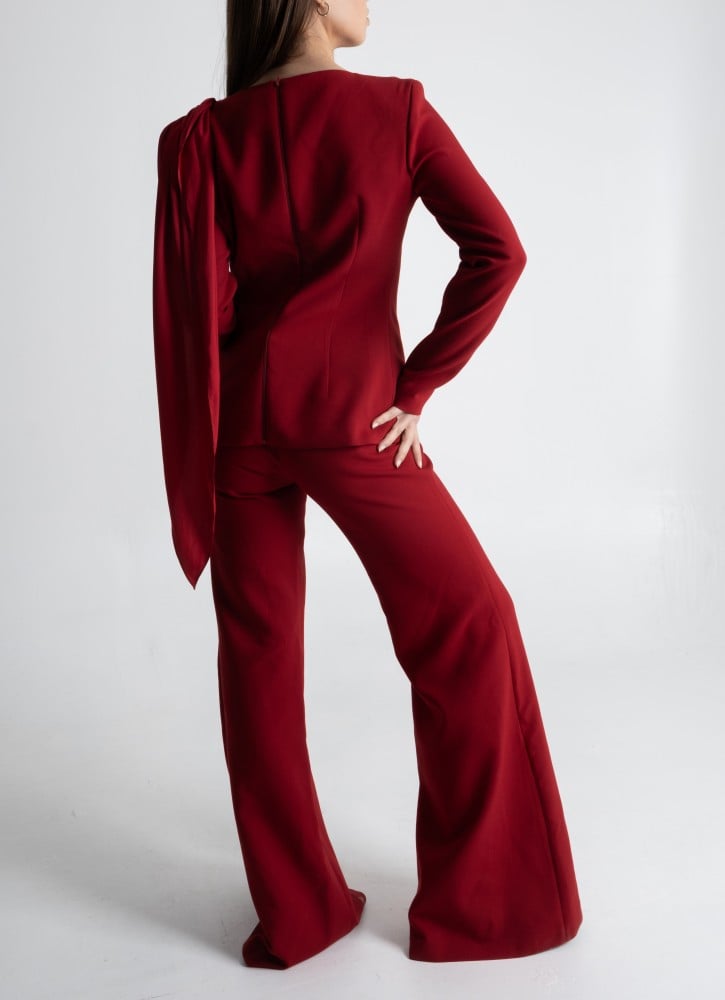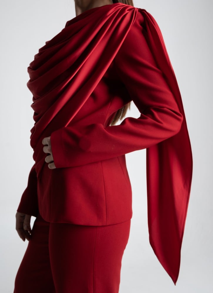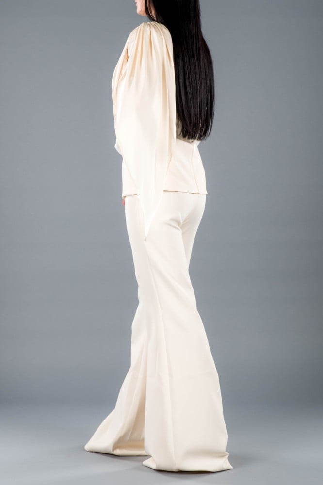 - القصة: جاكيت مزخرف بتفاصيل حرير على الكتف مع بنطال واسع