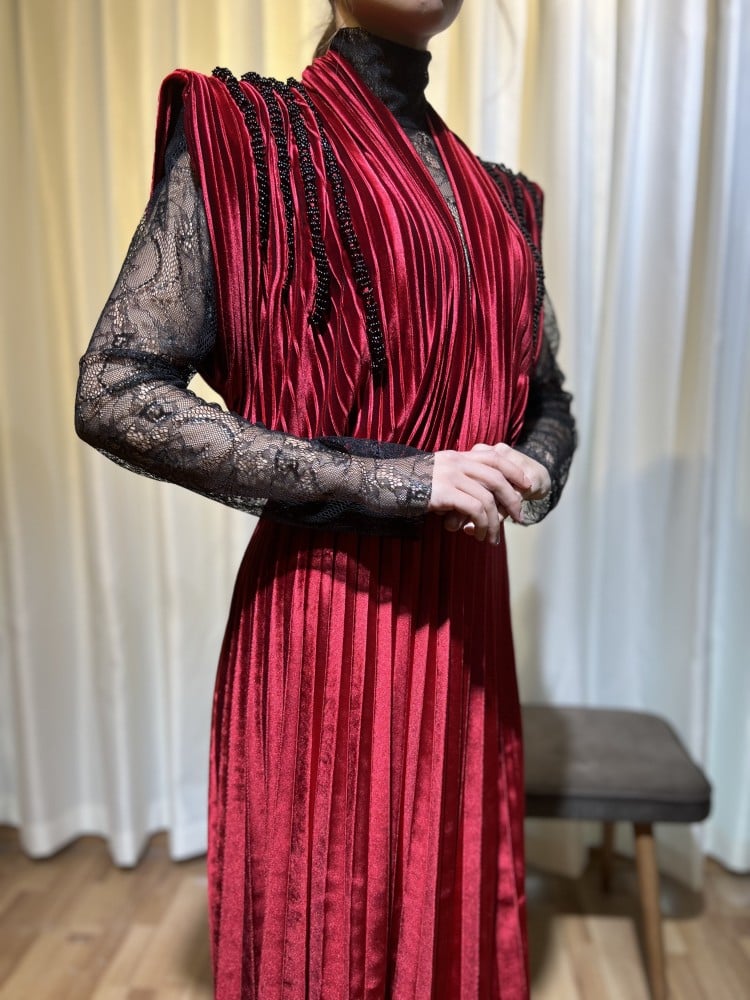 فستان بليسيه قطيفة بحزام مبطن بالدانتيل موف