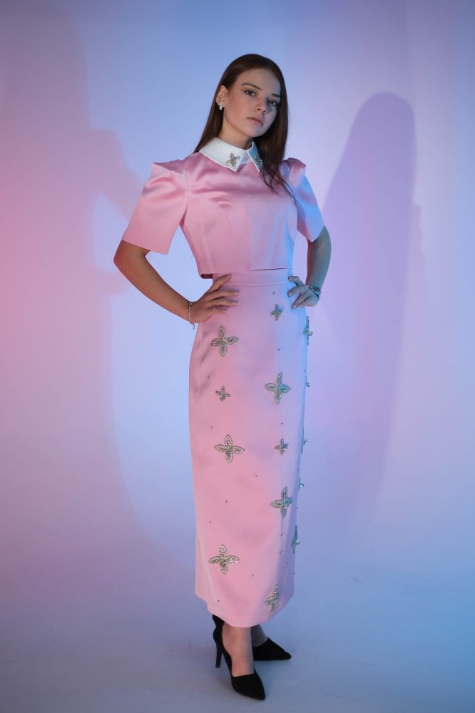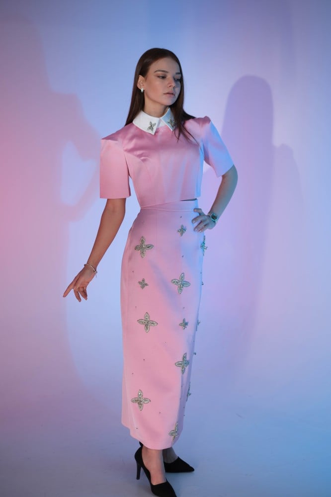 - طقم سهرة تصميم فاخر ماكسي من حرير الساتان مطرّز بأحجار لامعة لإضافة لمسة فخمة