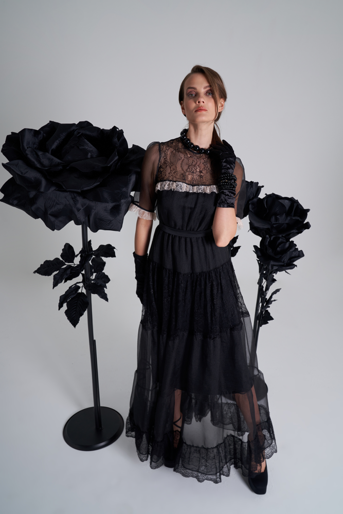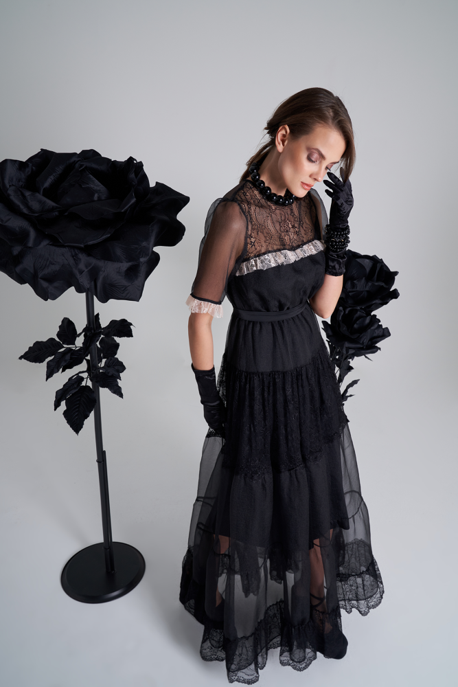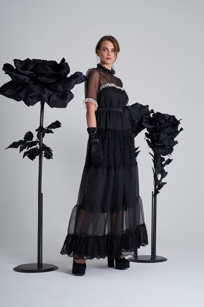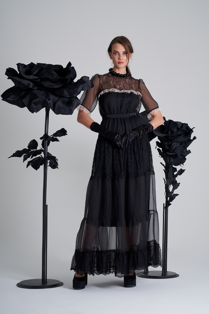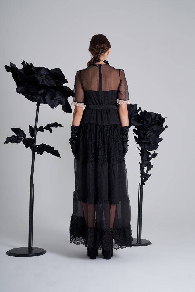 فستان اورقنزا أسود بقصات عرضية