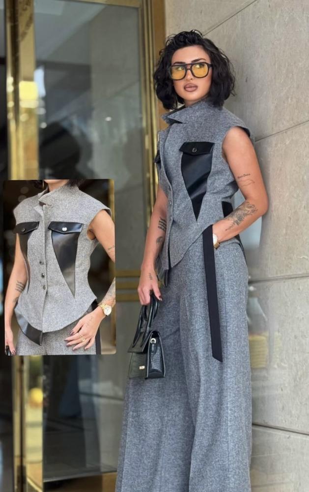 بدلة صوف خريفية مزينة بالجلد
