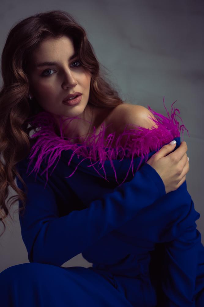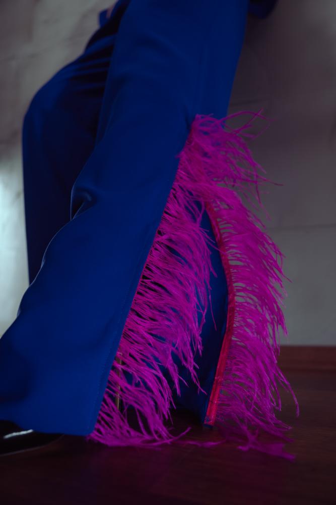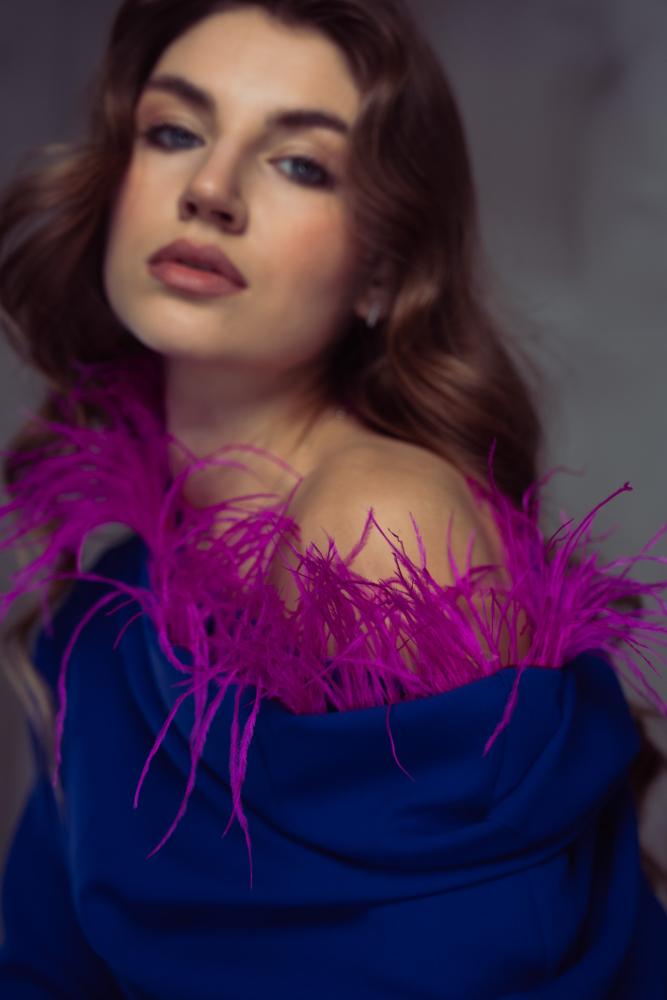 - اللون: أزرق مع تفاصيل ريش فوشيا