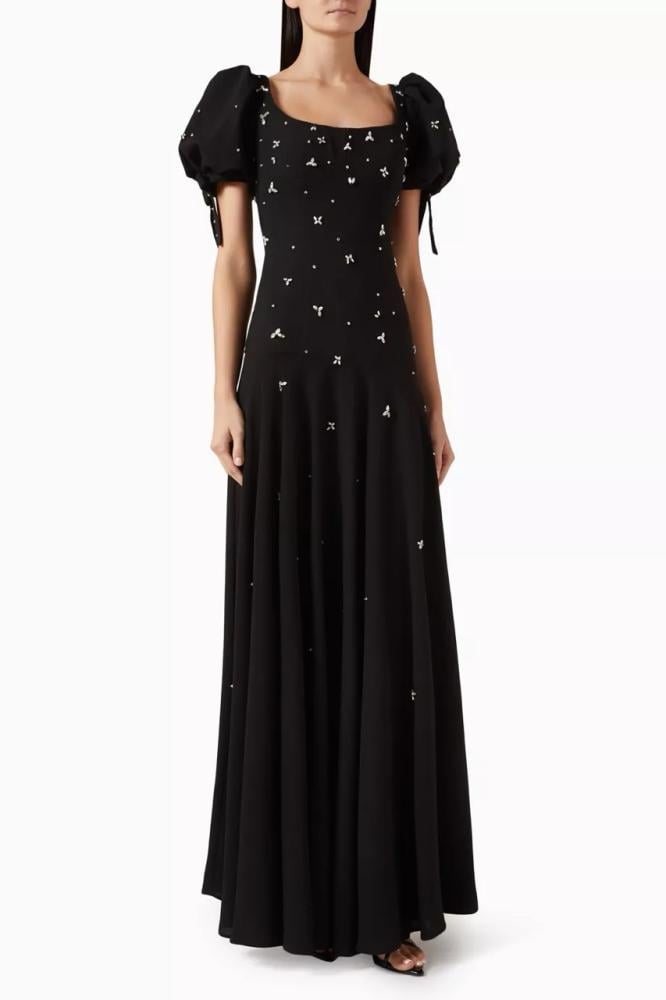 فستان سهرة فاخر من تصميم طارق إيديز، متوفر حصريًا لدى [EFRUZ] كموزع معتمد في السعودية. تصميم مكسي أنيق من قماش الكريب الفاخر، مزين بكاب دانتيل منسدل يضفي لمسة ملكية.