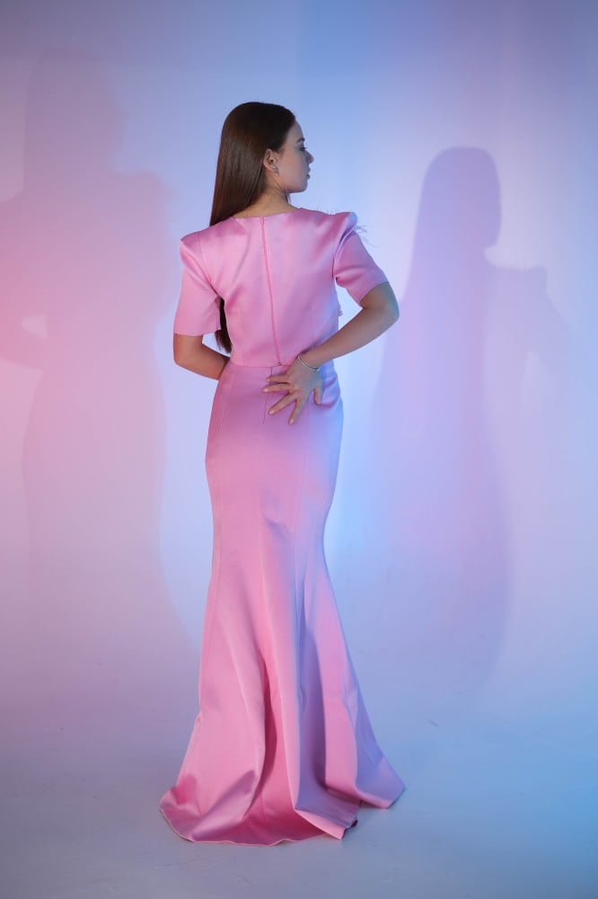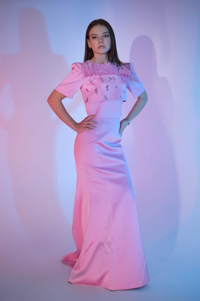 BIRGUL طقم ماكسي حرير ساتان مزين بالريش "وردي"