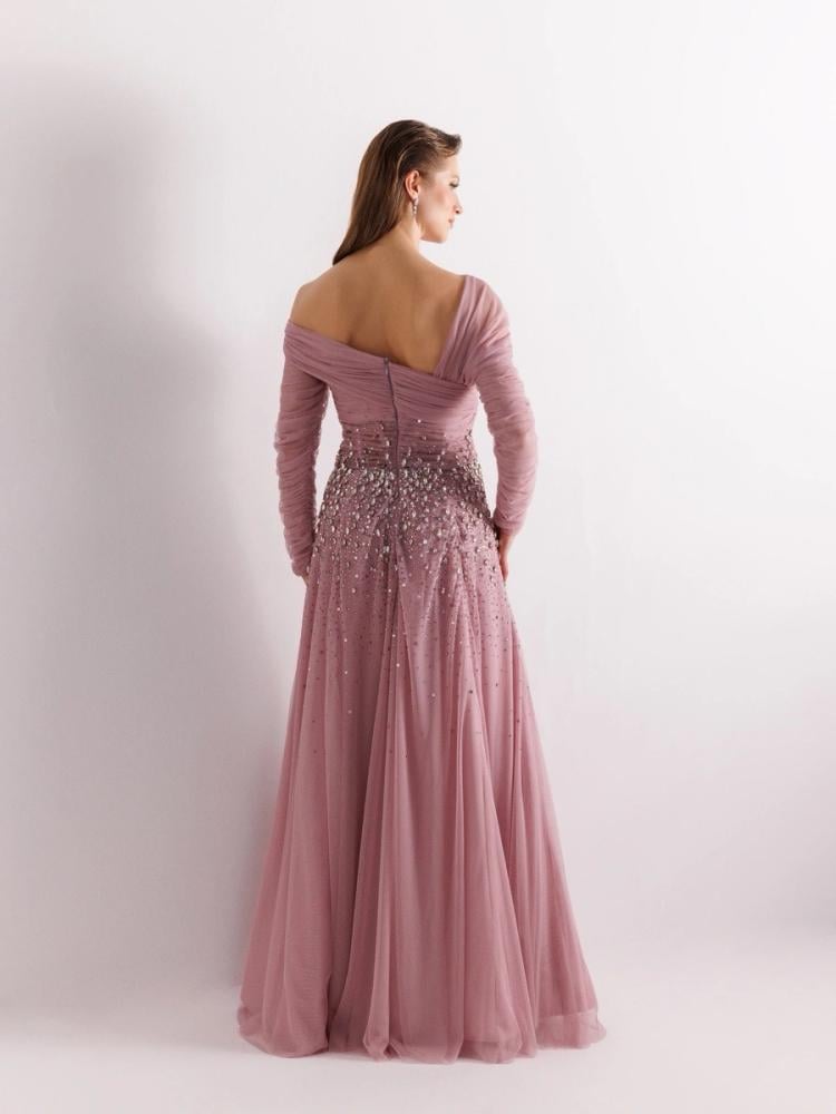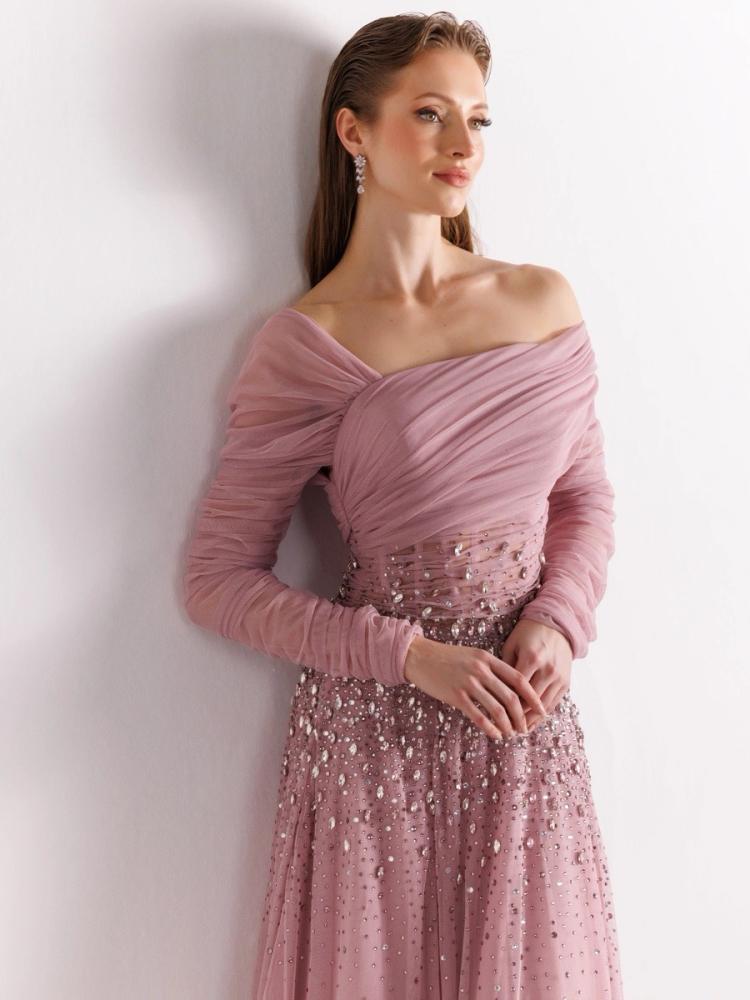 فستان كريب مطرز بالاحجار و انحناءات أمامية