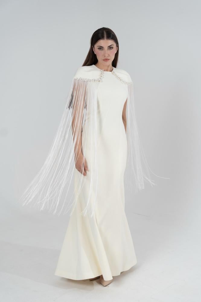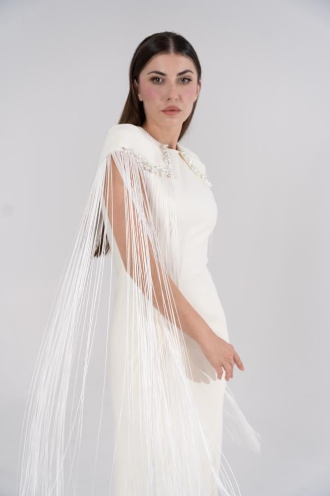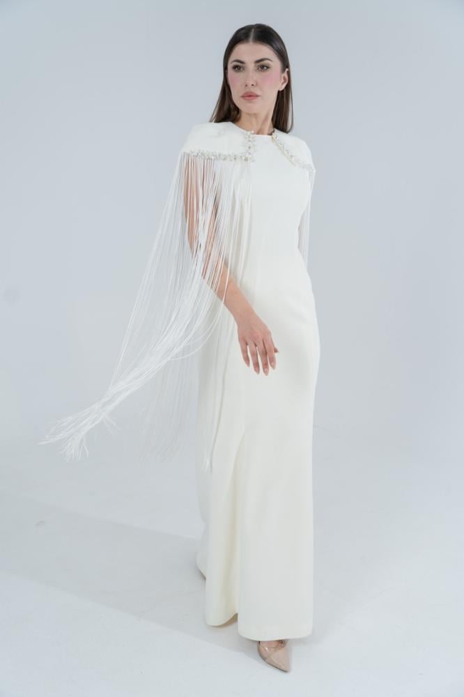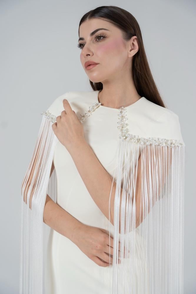 ONGUN فستان سهرة بهدب وتطريز أبيض