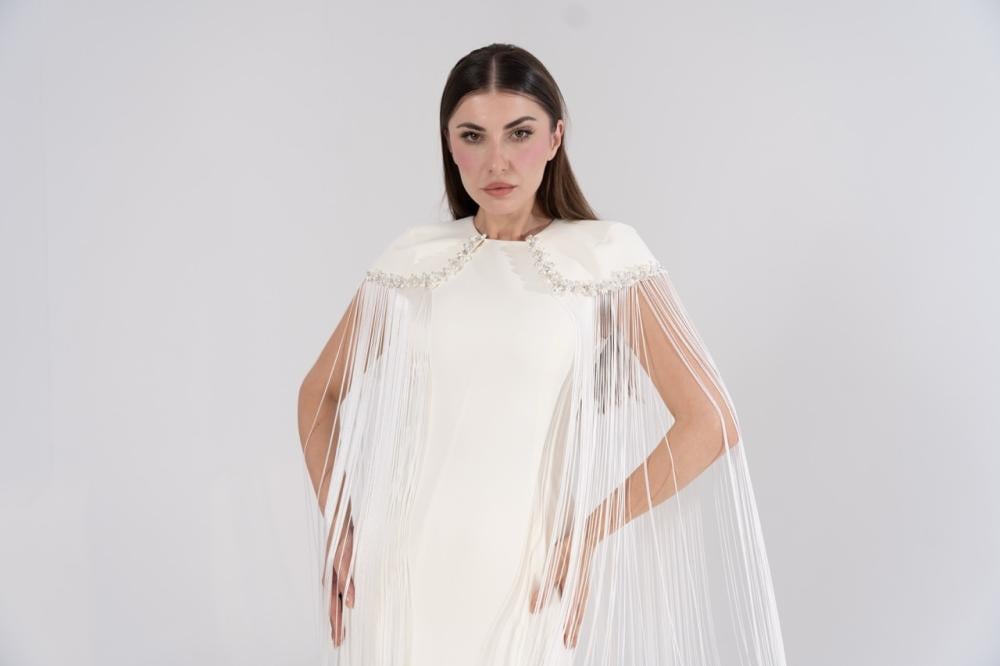 فستان كريب مزين بجدائل كرستال وأكمام منسدلة "لونين"