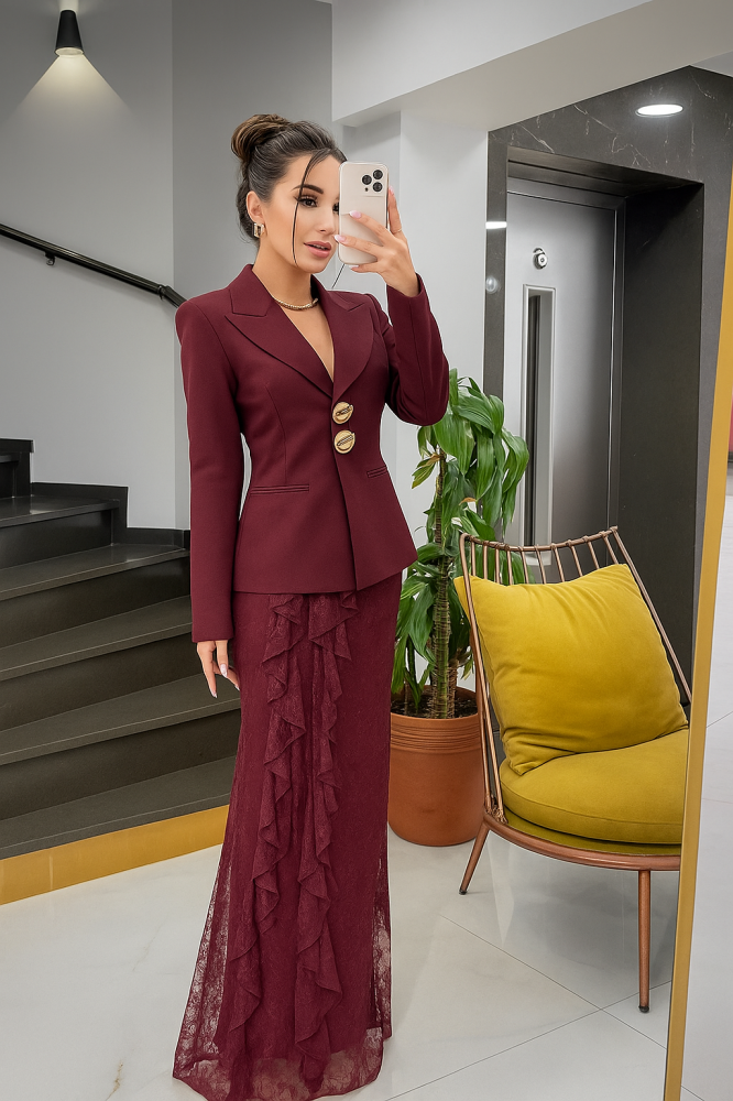 طقم قيادي فاخر... لأن التميز يبدأ من الإطلالة وصف الموديل:طقم رسمي أنيق يتكون من:بليزر بلون خمري فاخر، بقصة محددة للخصر، مزود بزرّين بارزين يمنحان حضو...