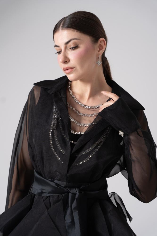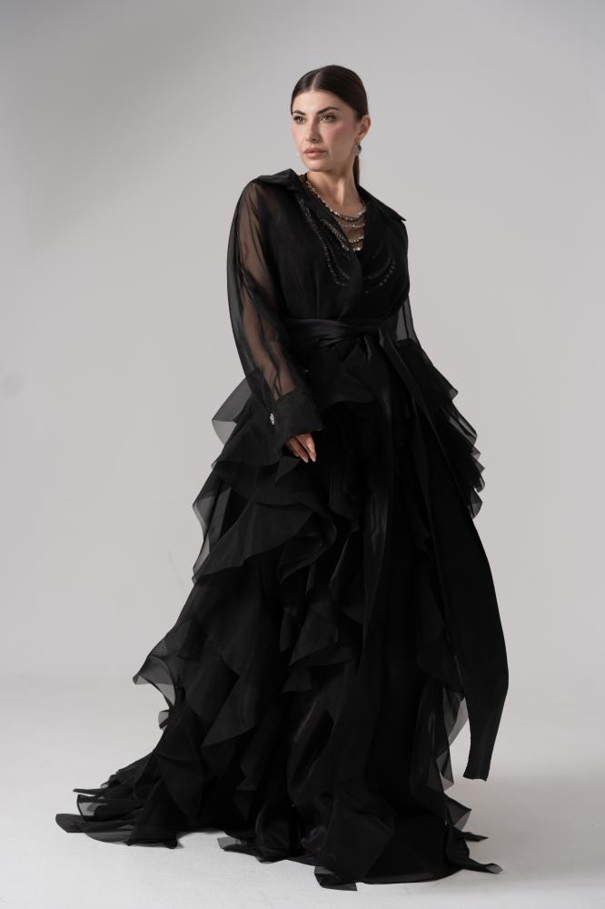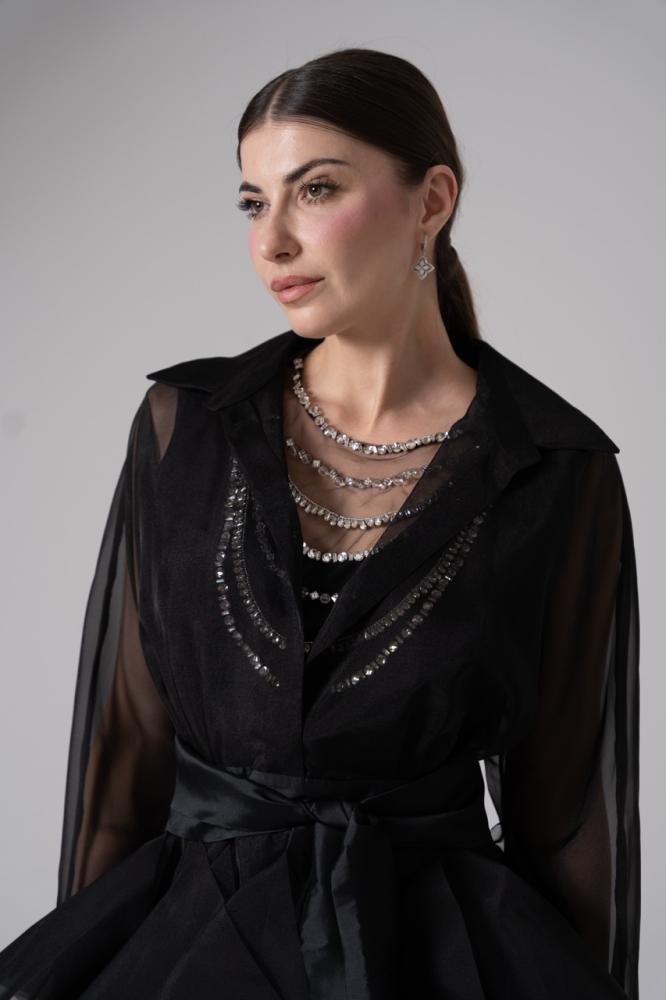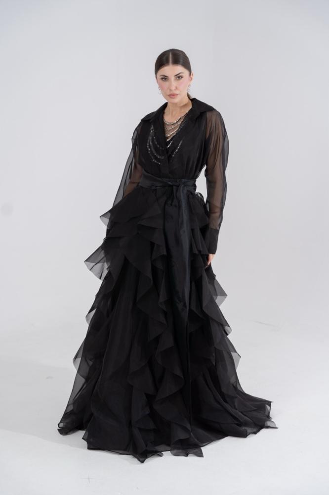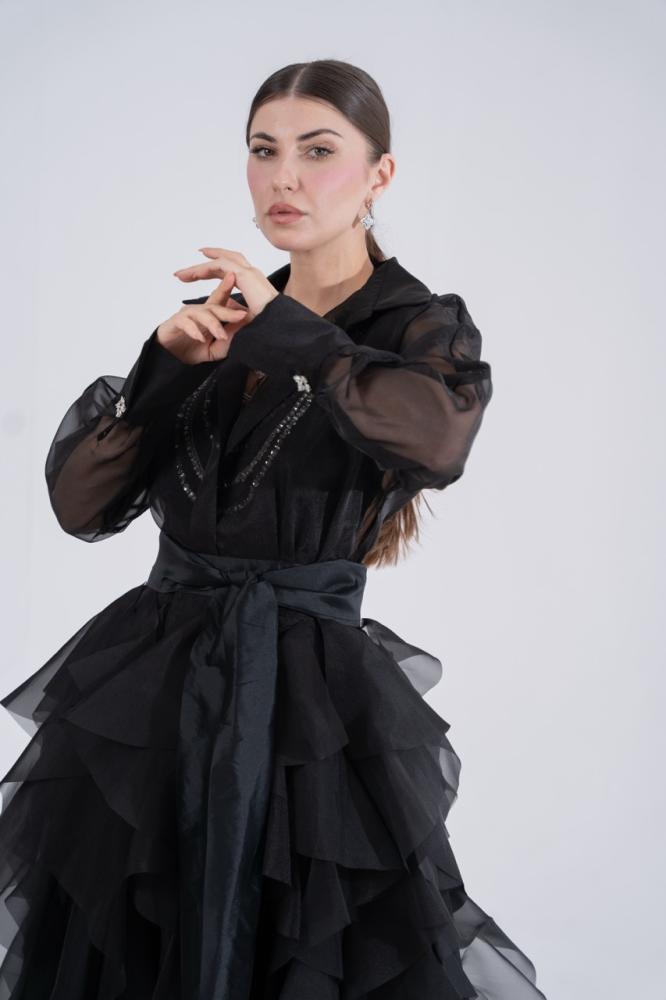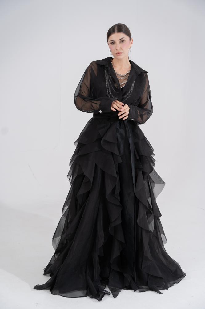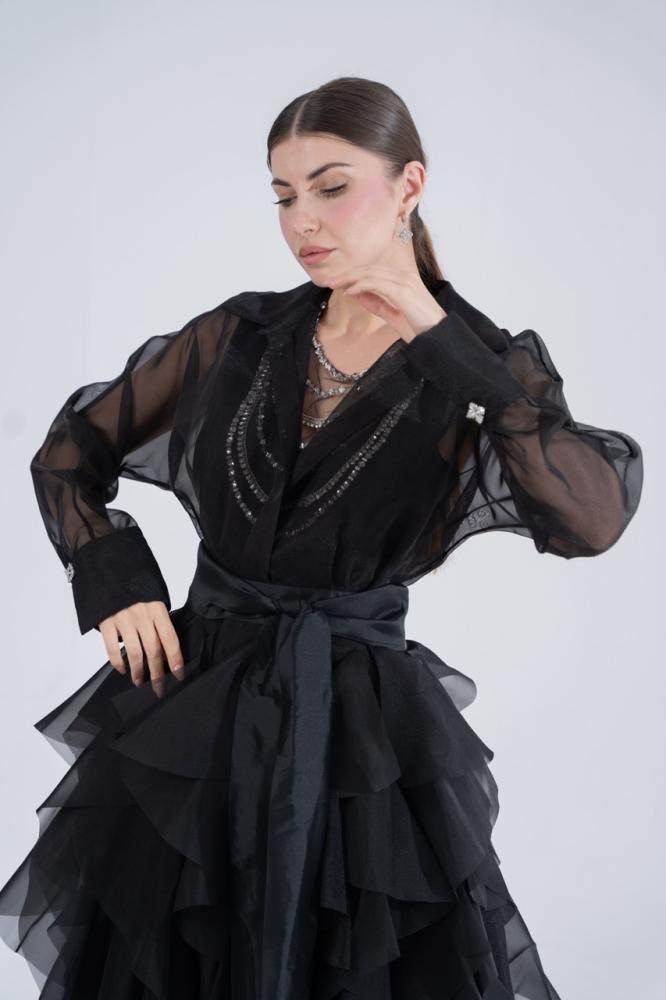- القصة: قميص حريري شفاف بأكمام طويلة وياقة كلاسيكية، يتصل بتنورة منفوشة من طبقات متعددة.