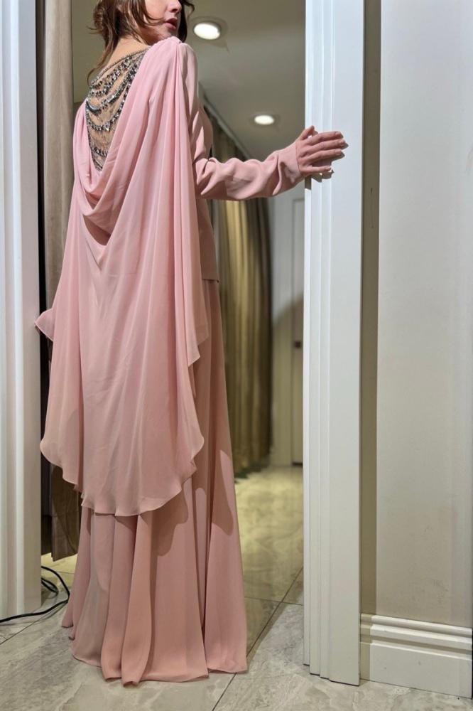 اختاري الفخامة التي تليق بكِ. اطلبي الآن فستان مع كاب من TARIKEDIZ بلونه الوردي الفاتن وعيشي لحظاتك كأميرة من وحي الحكايات.