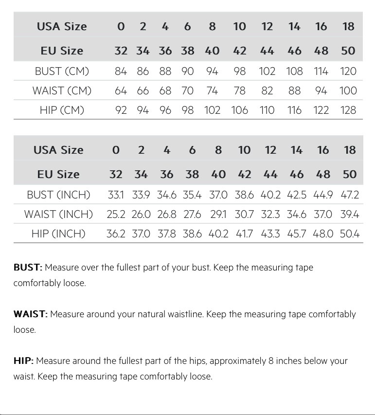 - اختيار المقاس المثالي قومي بقياس الصدر والخصر والأرداف باستخدام شريط القياس ثم اختاري المقاس الذي يتناسب مع القياسات في الجدول المرفق إذا كنتِ بين مقاسين يفضل اختيار المقاس الأكبر لضمان الراحة والحركة
