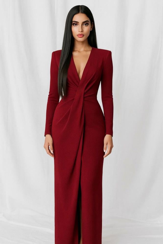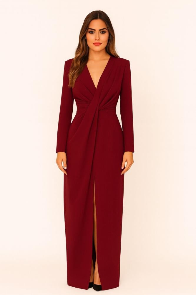 فستان عصري مكسي بلون نبيذي داكن يثير الإعجاب بفضل تصميمه الفريد الذي يعكس أنوثتكِ بكل تفاصيله مع مسرّة أمامية تضيف لمسة جذابة يضمن لكِ إطلالة لا تُنسى قطعة واحدة ستكونين محط الأنظار.