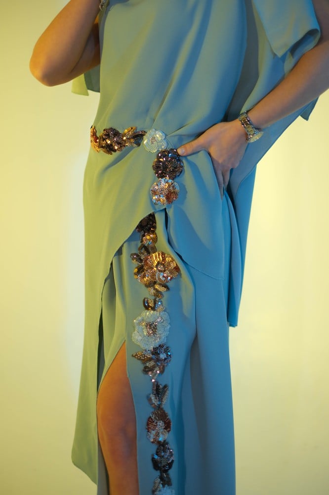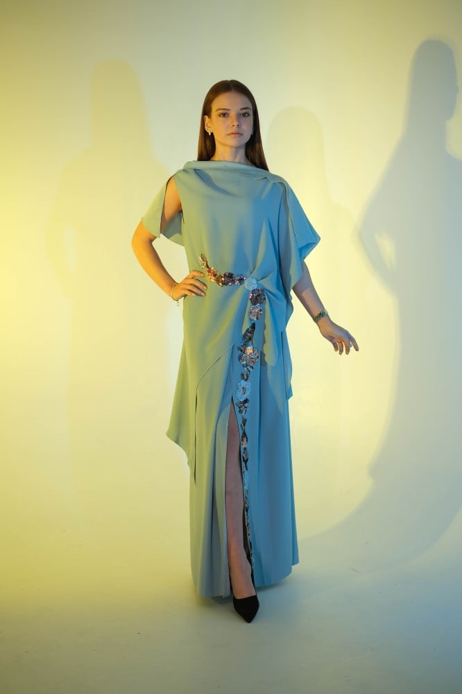- طقم سماوي مصمم من قماش عالي الجودة يوفر لكِ راحة وأناقة طوال السهرة أو المناسبة