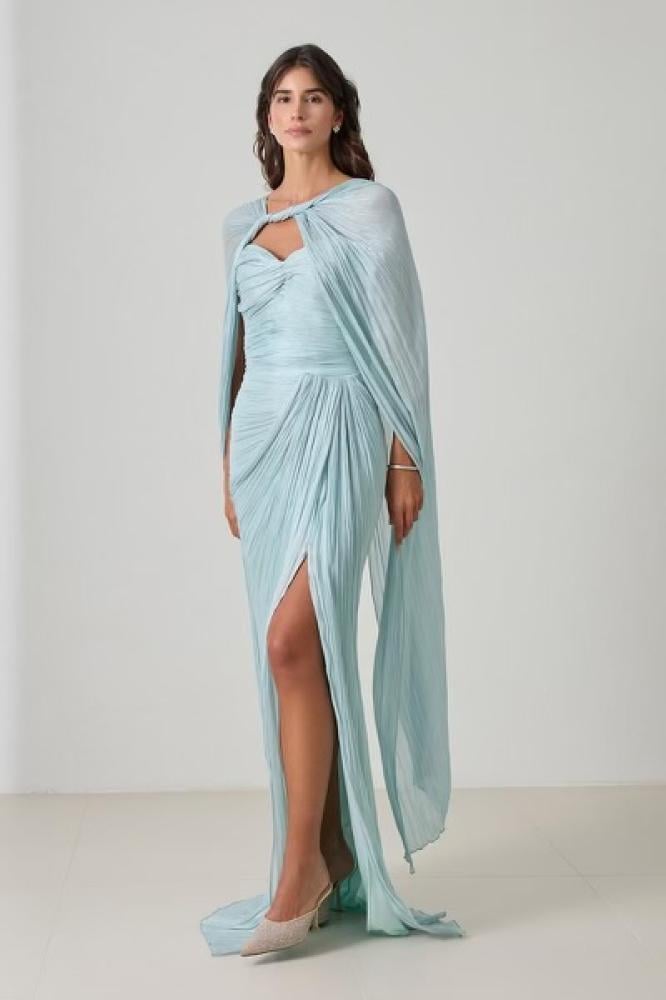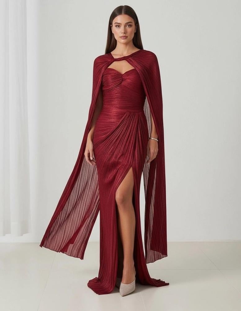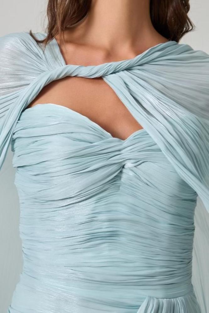 فستان شيفون لاميه بدرابية ووشاح على الكتف